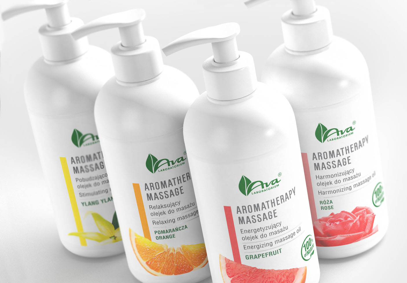 Projekty opakowań Aromatherapy Massage (AVA Laboratorium). Jest to linia aromatycznych olejków do masażu przeznaczonych na rynek detaliczny i profesjonalny (gabinety kosmetyczne). W celu podkreślenia profesjonalnego charakteru produktu została zastosowana oszczędna grafika z dużą ilością bieli oraz delikatnymi motywami srebrnego hotstampu. Dodatkowo, projekty opakowań Aromathrapy Massage, zawierają wyróżnik aromatu w postaci jego atrakcyjnego zdjęcia.
