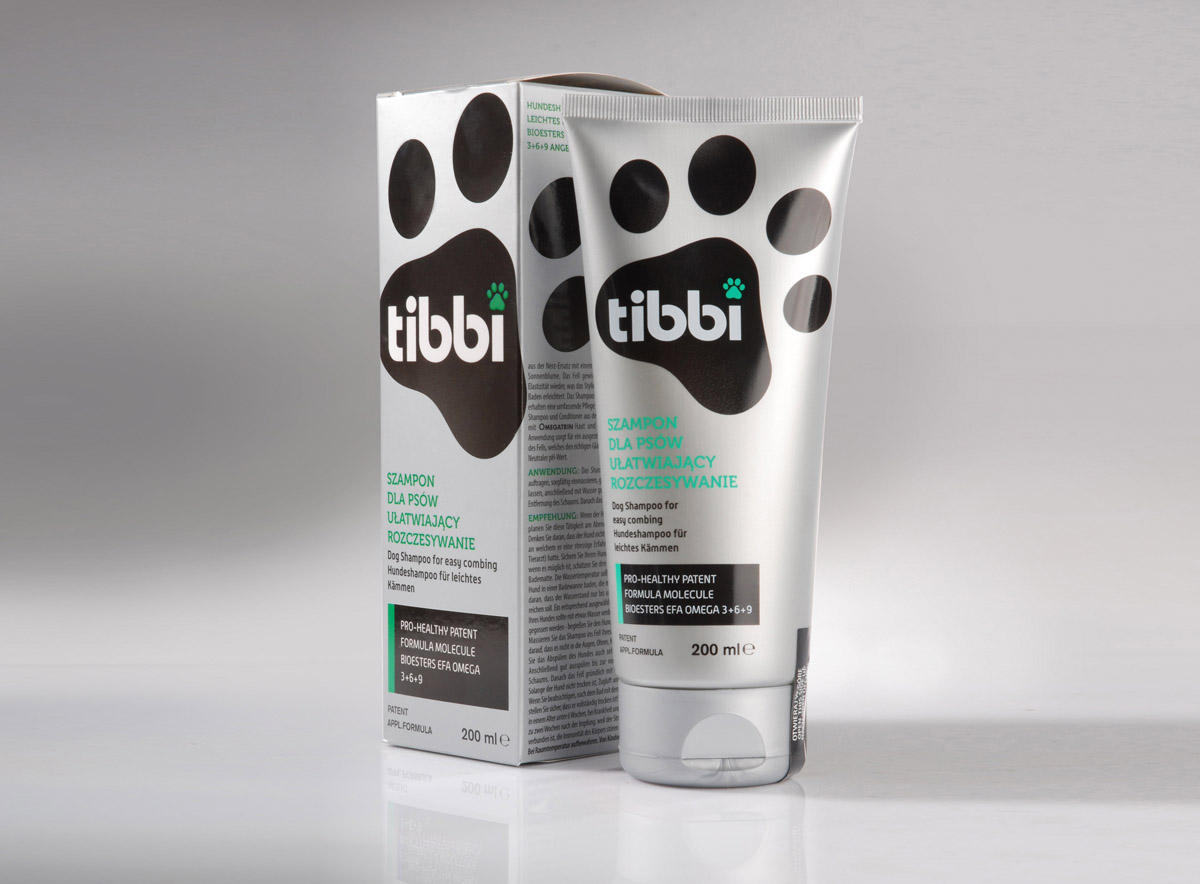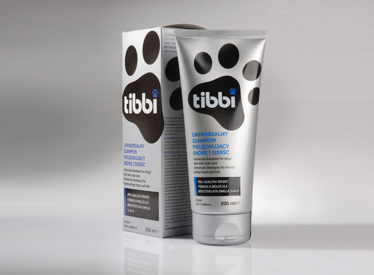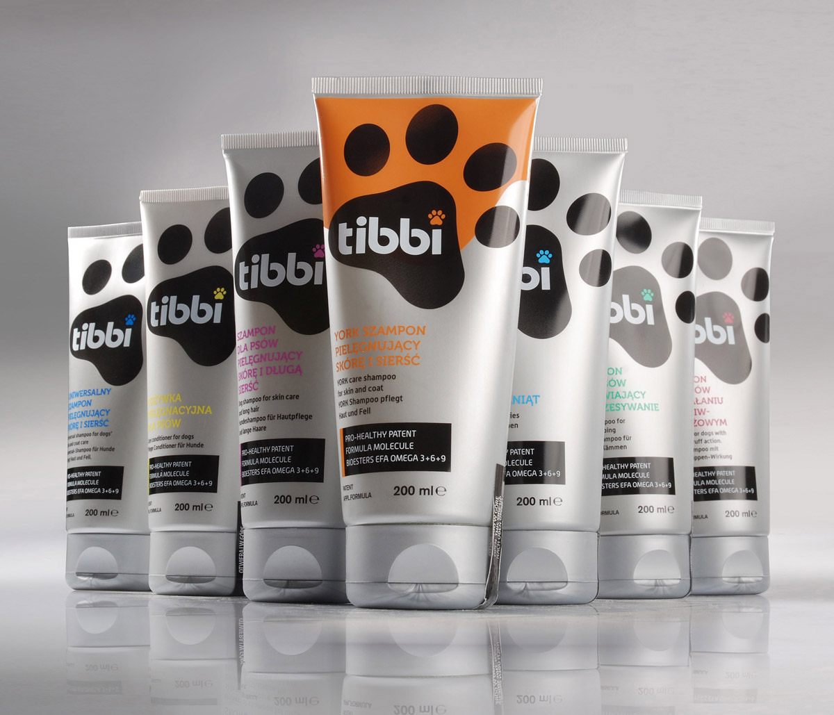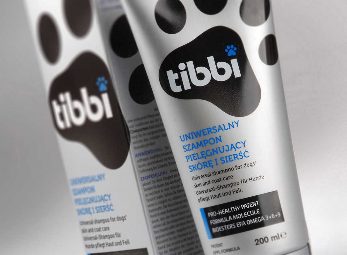 Projekty opakowań Tibbi. Właściciele psów stale poszukują jak najlepszych kosmetyków dla swoich pupili. Tibbi to szampony w grupie Premium, o recepturze opartej na naturalnych składnikach oraz estrach Omega 3+6+9. Zapewniają one znakomity wygląd i czystość sierści. Projekty opakowań Tibbi pozycjonują te produkty jako nowoczesne i o skutecznym działaniu. Mocno zaakcentowane logo na froncie pozwala wyróżnić markę Tibbi na sklepowych półkach.